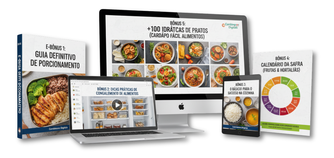 Você receberá um sistema completo de planejamento de refeições. Isso inclui: os cardápios semanais prontos e todos os 5 guias de Bônus (Listas de Compras, Porcionamento, Congelamento, etc.). Todo o material é em formato PDF, otimizado para ser visualizado em celular, tablet ou para ser impresso, se preferir (Responsividade).